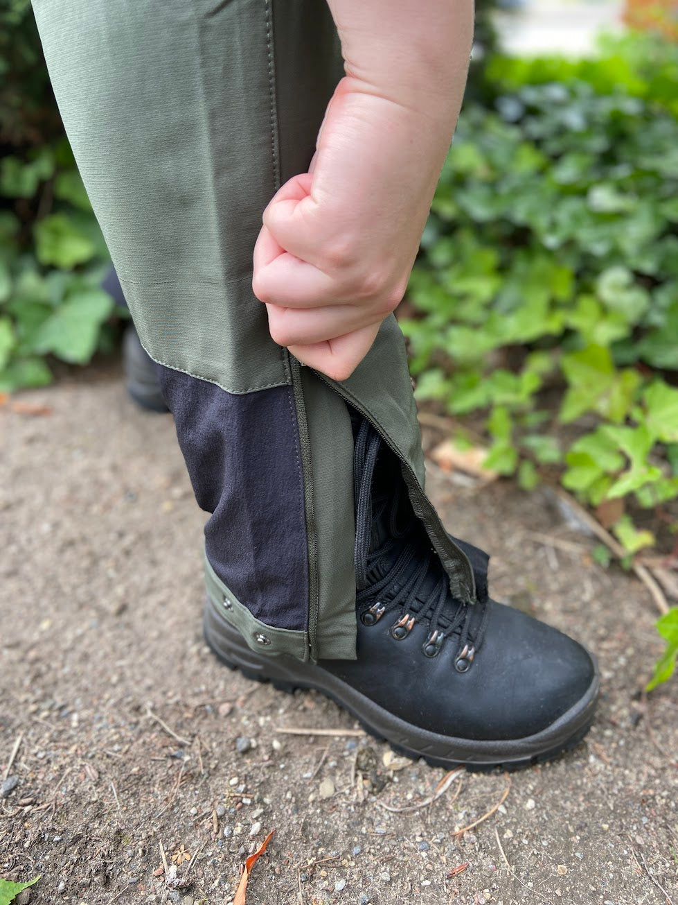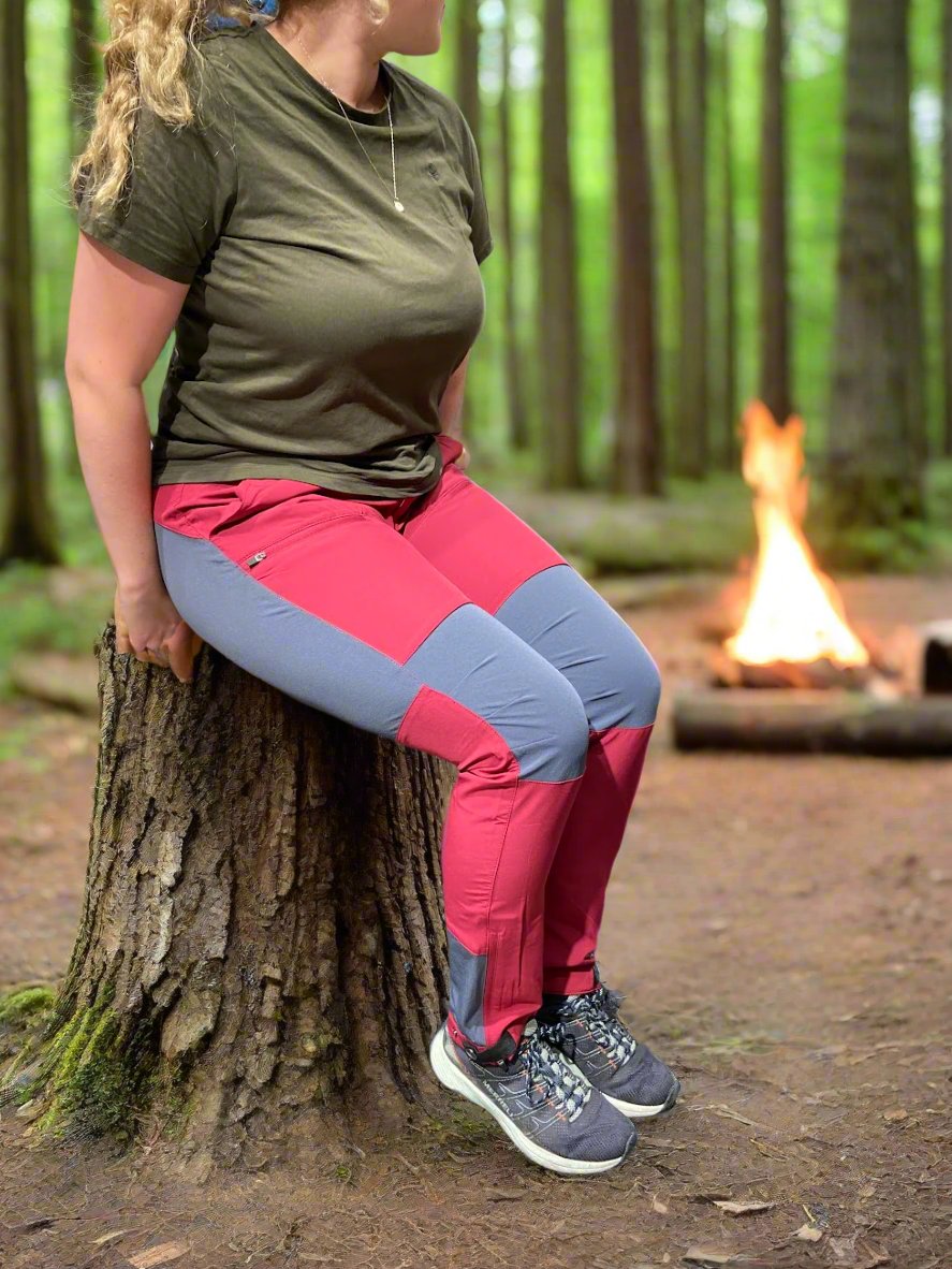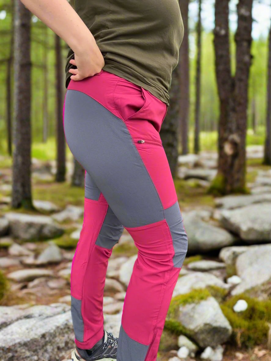 Slitstark och snygg vandringsbyxa i damstorlekar. Gråa stretchpartier över knä och stuss på färgen dark berry, svarta partier på färgen green. Vind- och vattenavvisande tyg. Stora fickor med blixtlås fram på byxan. Reglerbara i bensluten.