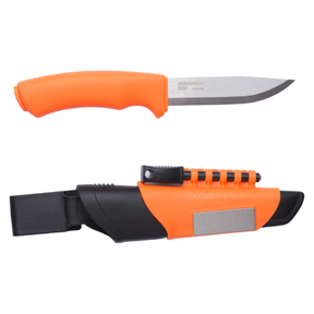 Det ergonomiska skaftet av polymer har ett mjukt friktionsgrepp, fingerskydd och ett 3,2 mm tjockt blad av återvunnet svenskt rostfritt stål, som ger både styrka och stabilitet i varje skär. Tack vare blad- och skaftkonstruktionen blir kniven optimal för att kunna arbeta säkert och effektivt i olika väderförhållanden året runt. Knivslidan av polymer har ett praktiskt bältes-clip, en bältes-loop och är utrustad med integrerat tändstål och diamantbryne. Optimerad och redo för oväntade utmaningar.