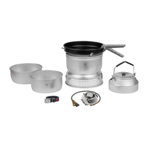 Detta är Trangias större kök, perfekt för 3-4 personer. Köket innehåller två kittlar i storleken 1.75 l respektive 1.5 liter, en stekpanna, en kaffepanna på 0.9 liter, ett vindskydd (övre och nedre del), gasolbrännare, handtag och rem.