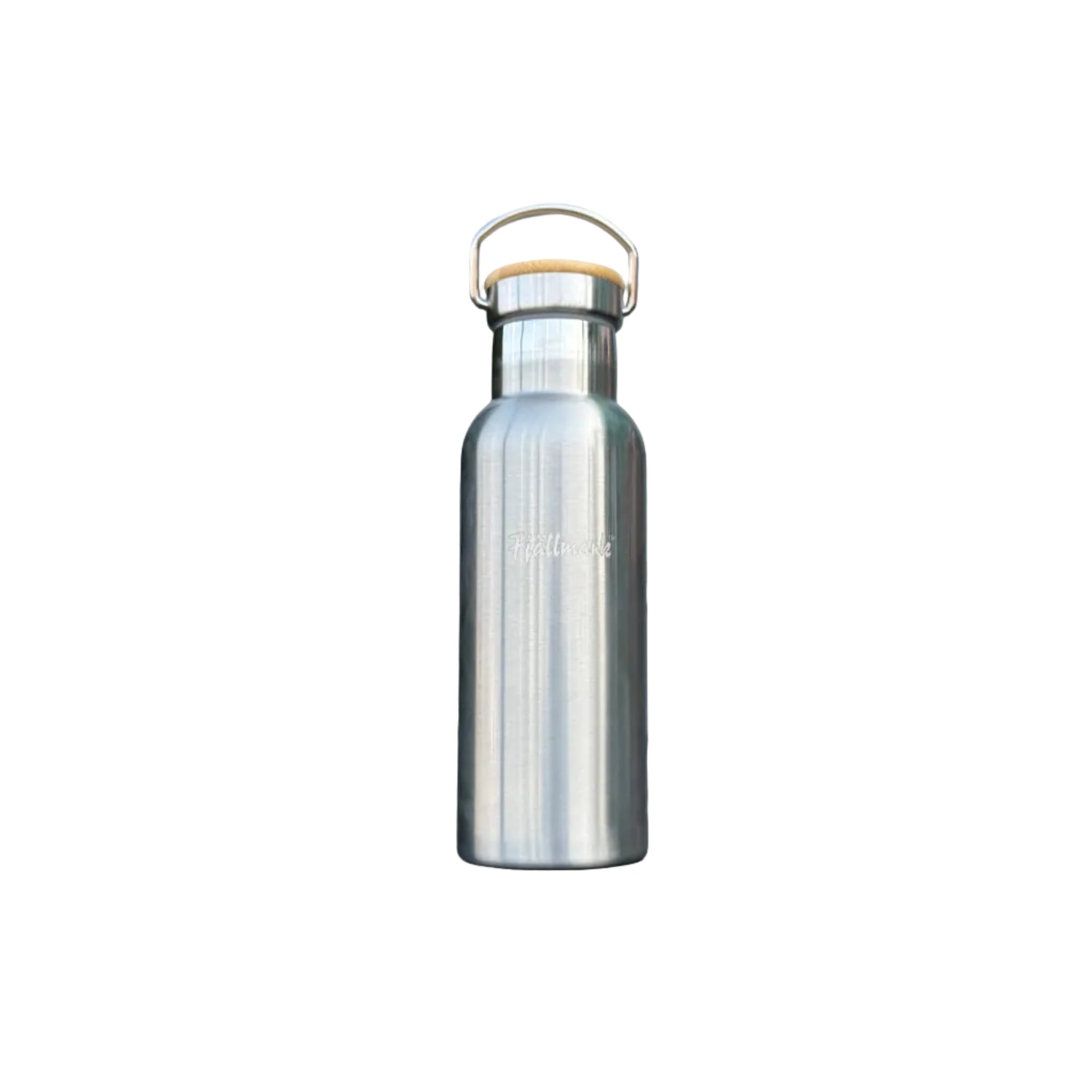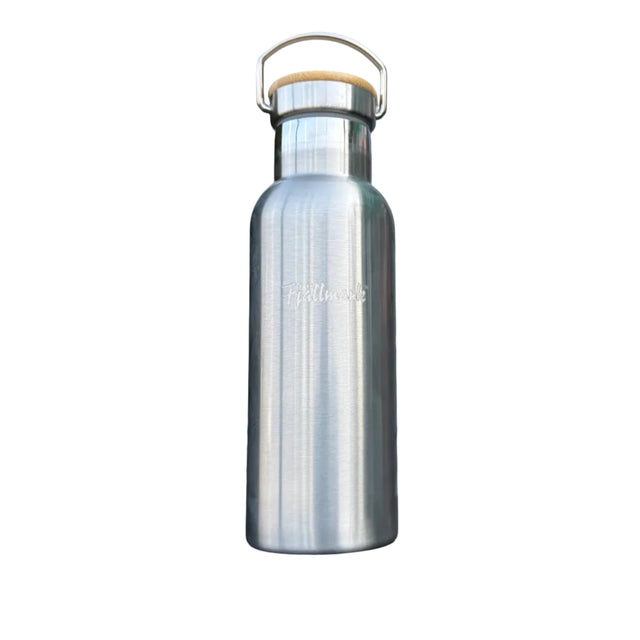 Isolerande flaska i rostfritt stål och kork med äkta bambu från Fjällmark. Perfekt till om du vill ha lite varm saft på dagsturen, eller förfriskande kallt vatten till vardags.