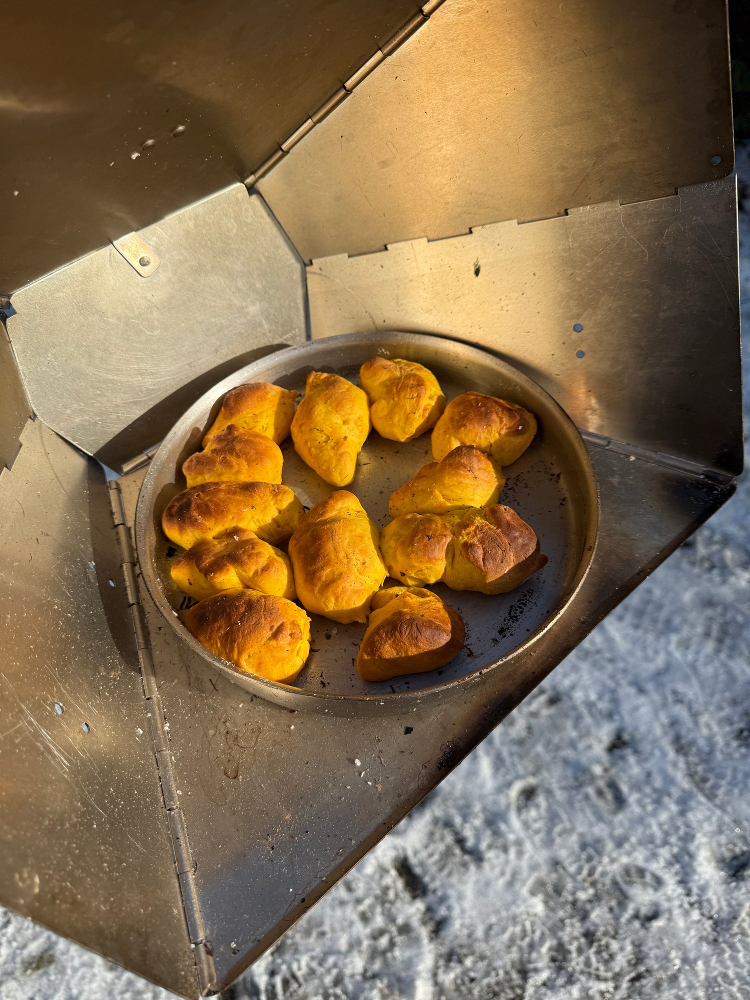 Hur lyxigt är det inte att kunna baka ute i naturen? Att bjuda på nygräddade lussebullar en kall decemberdag, en varm macka på lunchpausen ute i skogen något annat smarrigt? Bara fantasin sätter gränser, och mat som lagas och äts i naturen smakar så mycket bättre! Att använda en reflektorugn är enkelt och det går fort. Gör upp elden, ställ din reflektorugn vid sidan av och det är klart för gräddning! Det du kan baka hemma i köket kan du göra vid den öppna elden. Surdegsbröd, muffins, potatisgratäng… Din fantasi och energi sätter begränsningen.