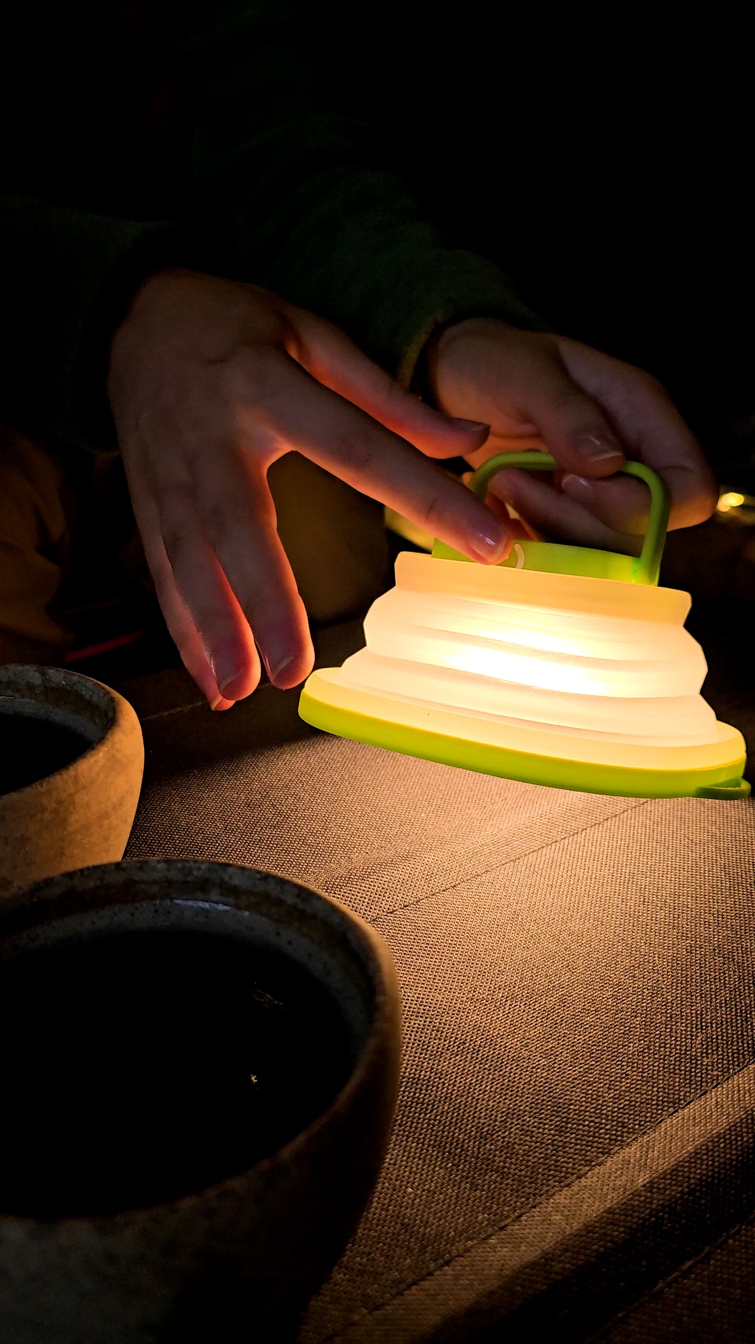 Smidig och lätt tältlampa som går att fälla ihop för enkel transport. Batteriet kan laddas med USB eller solenergi. Lampan har ett handtag för att kunna hängas upp men kan likaväl ställas för ett mjuk och mysigt ljus,