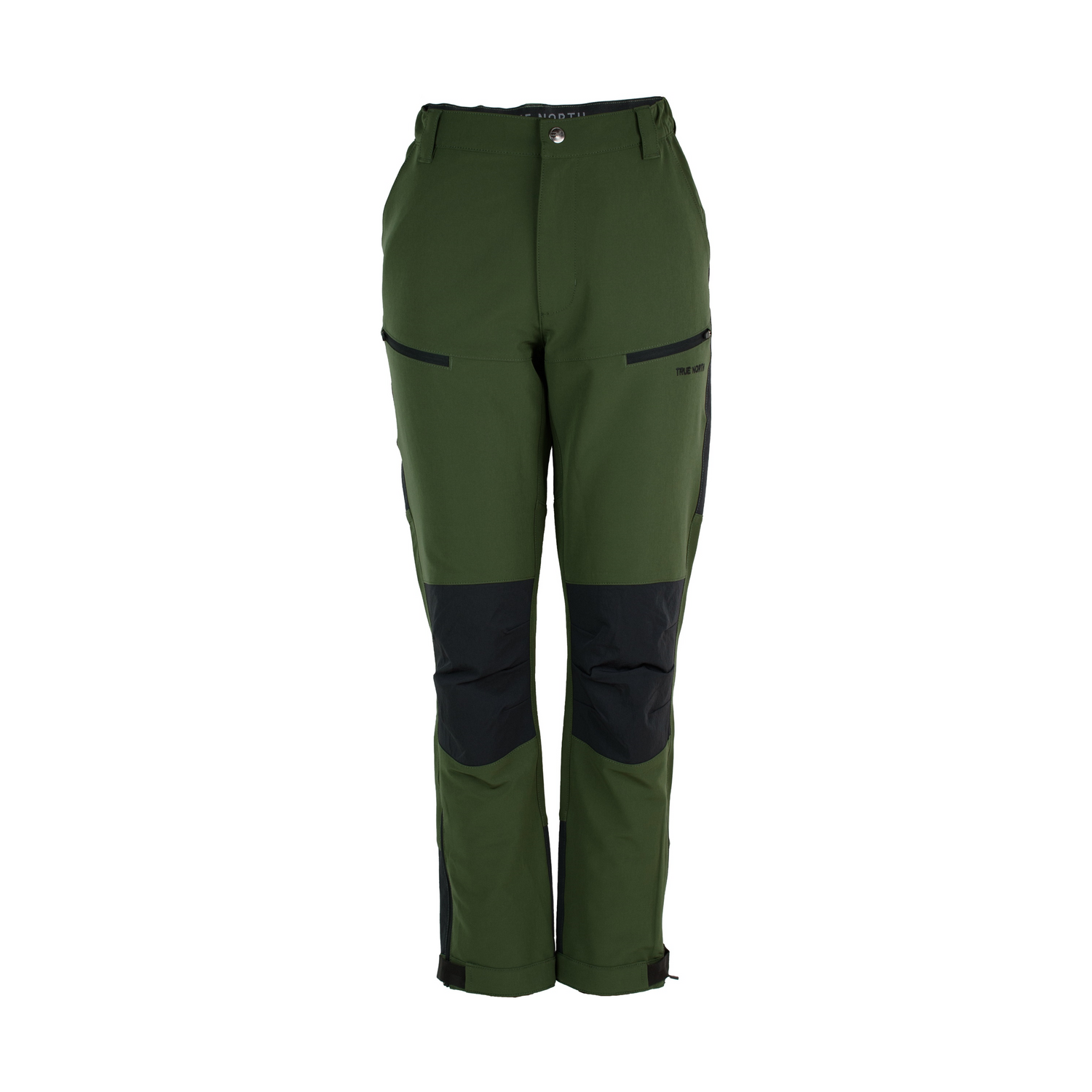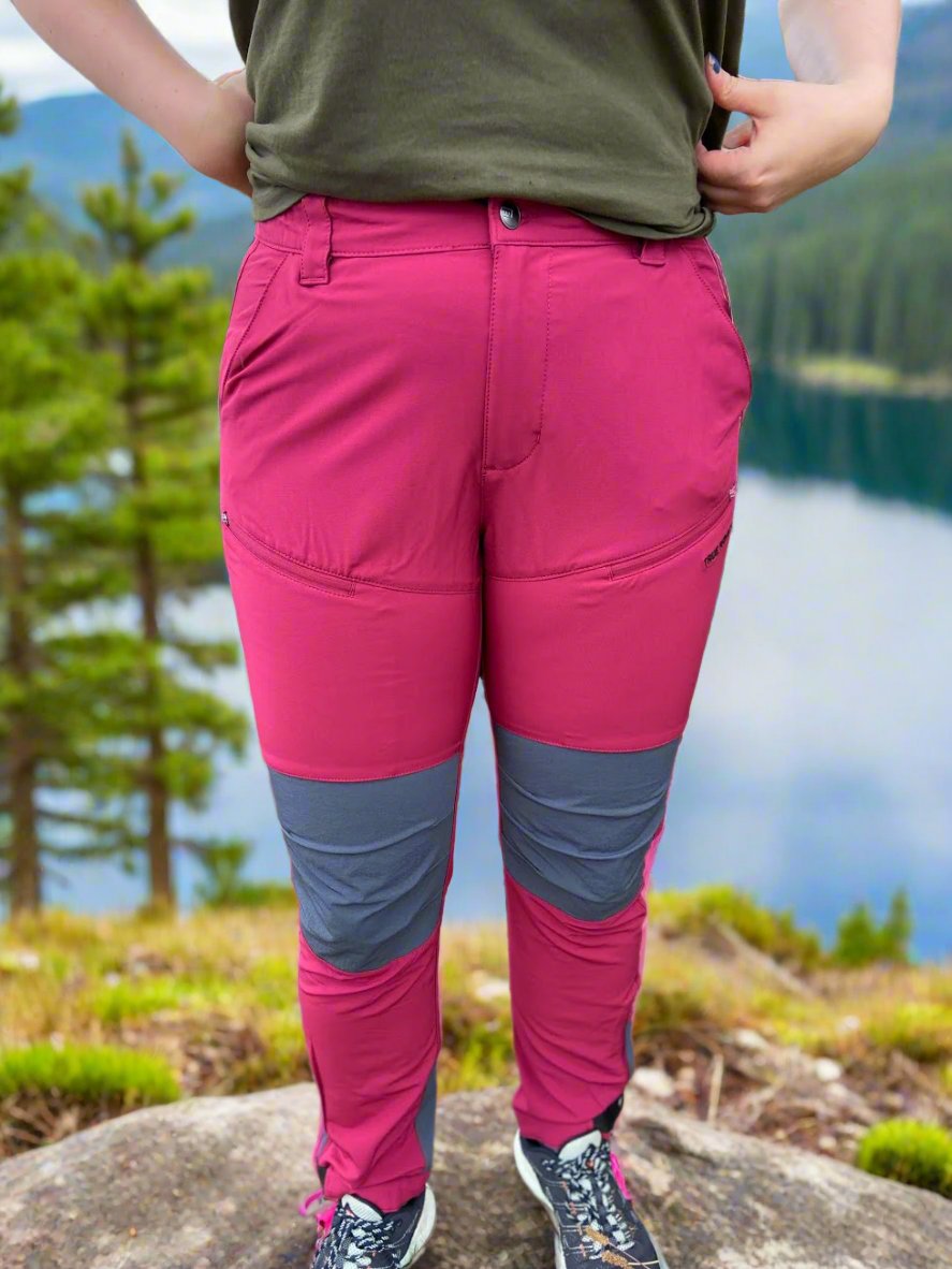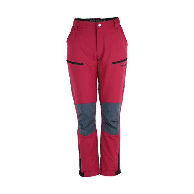 Slitstark och snygg vandringsbyxa i damstorlekar. Gråa stretchpartier över knä och stuss på färgen dark berry, svarta partier på färgen green. Vind- och vattenavvisande tyg. Stora fickor med blixtlås fram på byxan. Reglerbara i bensluten.