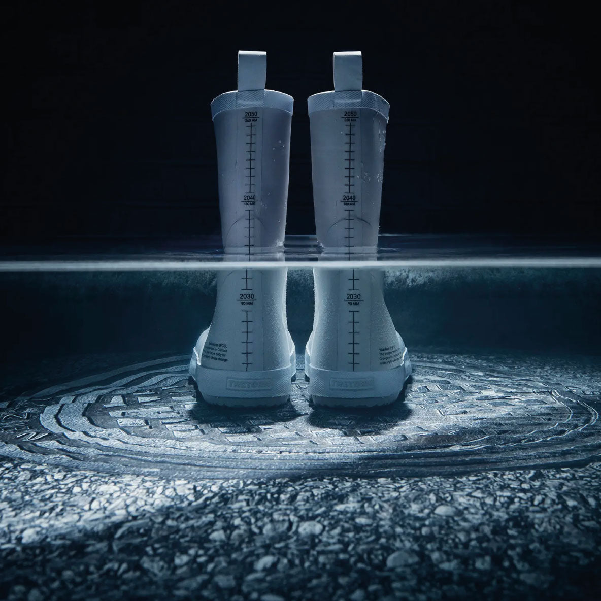 Sea Level Boot är Tretorns mest ikoniska gummistövel — producerad med ett mindre fotavtryck. Materialet som har använts för att tillverka Sea Level Boot är noga utvalt för att minimera miljöpåverkan. Både yttersulan och ovandelen är tillverkade av FSC-certifierat naturgummi, och fodret är tillverkat av återvunnen polyester. På insidan är innersulan tillverkade av BLOOM, ett material gjort på den unika algbiomassan som utvinns från algblomning i haven. BLOOM är en ny innovation som gör det möjligt att återvinna skadlig algblomning från våra hav för att i sin tur skapa ett hållbart material. När den skördas och sätts under värme och tryck genomgår den en process, vilket gör att den går att använda som material i Sea Level Boot. Till år 2050 kan havsnivån stiga med 26 cm på grund av klimatkrisen. Ett faktum som är svårt att greppa. Därför har Sea Level Boot en mätsticka på baksidan som illustrerar just detta. Som en påminnelse om förändringarna som måste hända – och konsekvenserna om de inte gör det.