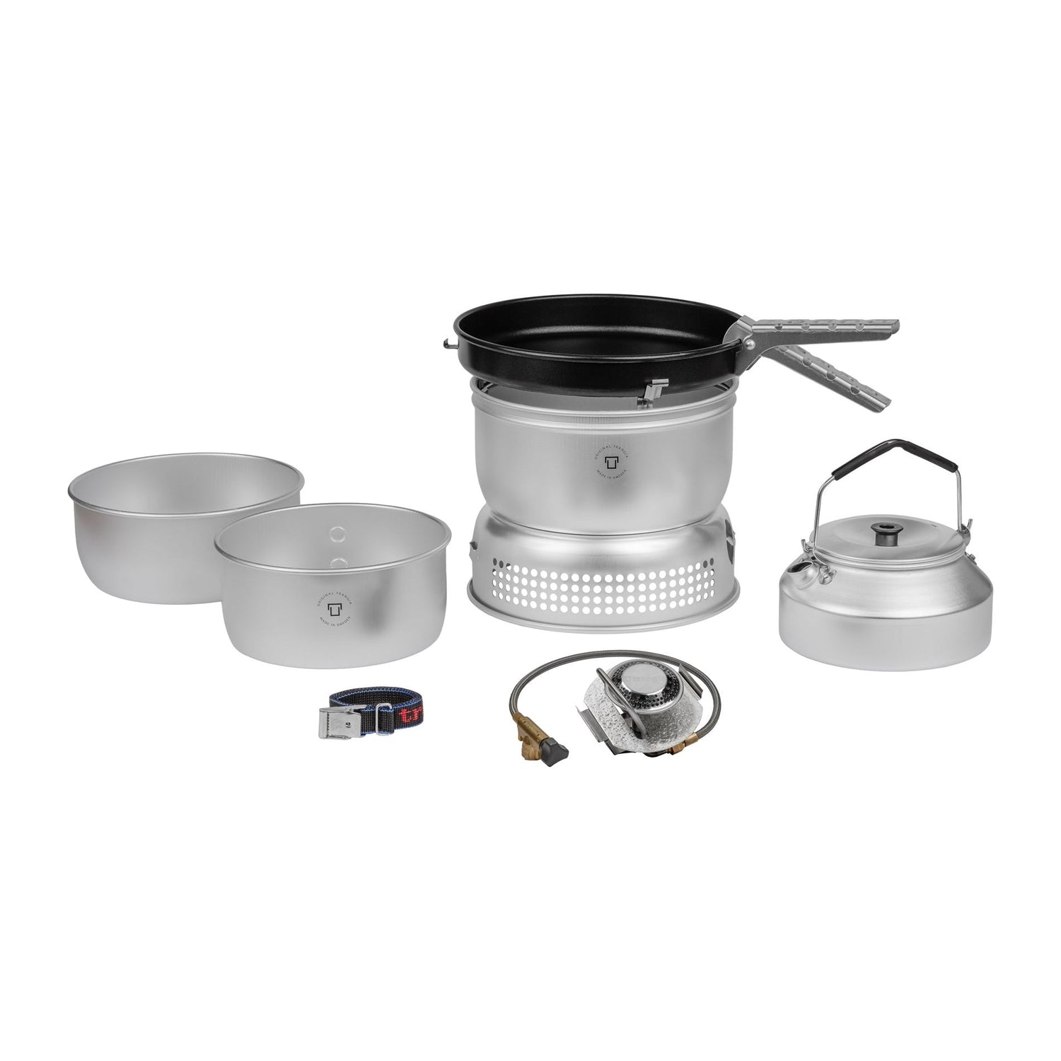 Trangiakök 25 kan kompletteras med kastruller och stekpannor i andra material, fodral, multi-disc och flera andra praktiska tillbehör.